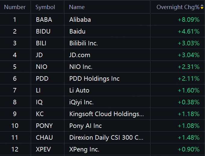24H | Chinese ADRs Jump. Alibaba Soars 8%; Baidu up 4%; Bilibili, JD.com up 3%; NIO, PDD up 2%; Li Auto, iQiyi, Kingsoft Cloud, Pony AI up over 1%