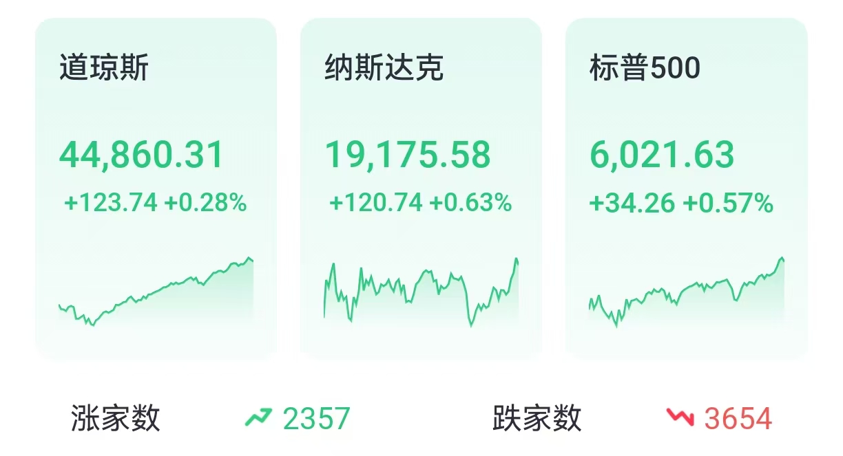 截至收盘,道琼斯指数涨0.28%,报44,860.31点,连涨五天;标普500指数涨0.57%,报6,021.63点,连涨第七天;纳斯达克综合指数涨0.63%,报19,174.30点,连涨四天。