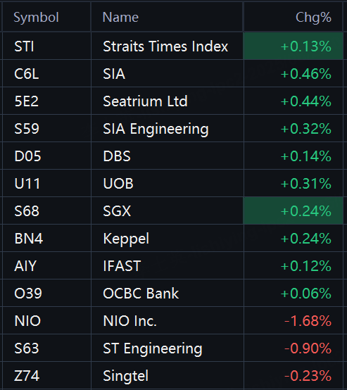 Singapore stocks opened higher on Thursday. STI rose 0.1%; SIA rose 0.5%; Seatrium rose 0.4%; UOB rose 0.3%; NIO fell 2%; ST Engineering fell 0.9%.