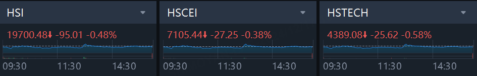 Hong Kong stock market closed lower. The Hang Seng Index (HSI) fell by 0.48%, the Hang Seng China Enterprises Index (HSCEI) fell by 0.38%, the Hang Seng Tech Index (HSTECH) fell by 0.58%, and the Hang Seng China-Affiliated Corporations Index (HSCCI) fell by 0.67%.