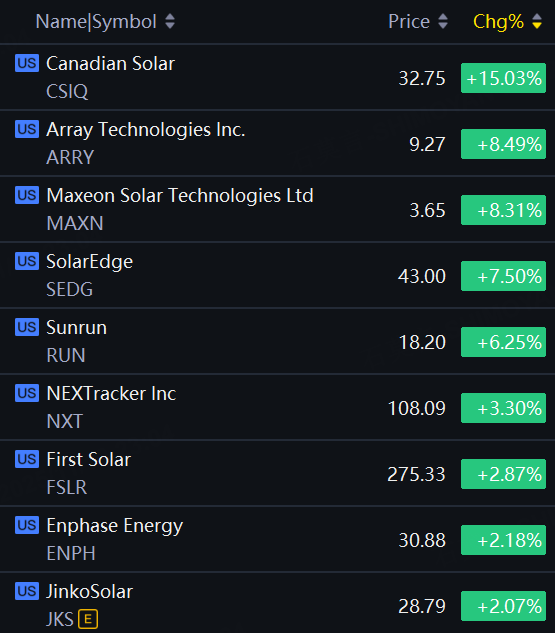 Solar stocks jumped on Monday. Canadian Solar up 15%; Array Technologies, Maxeon Solar up over 8%; SolarEdge up 7%; Sunrun up over 6%.