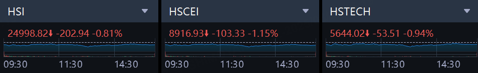 HSI down 0.81%, HSCEI down 1.15%, and HSTECH down 0.94%. However, HSCCI rose by 0.35%.