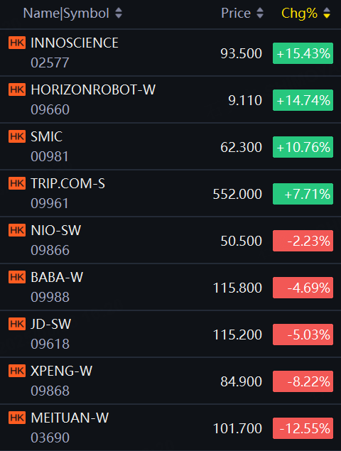 InnoScience, Horizon Robotics surged around 15%; SMIC rose by 11%; Trip.com up about 8%; NIO down 2%; Alibaba down over 4%; JD.com down 5%; XPeng down 8%; Meituan plunged over 12%.