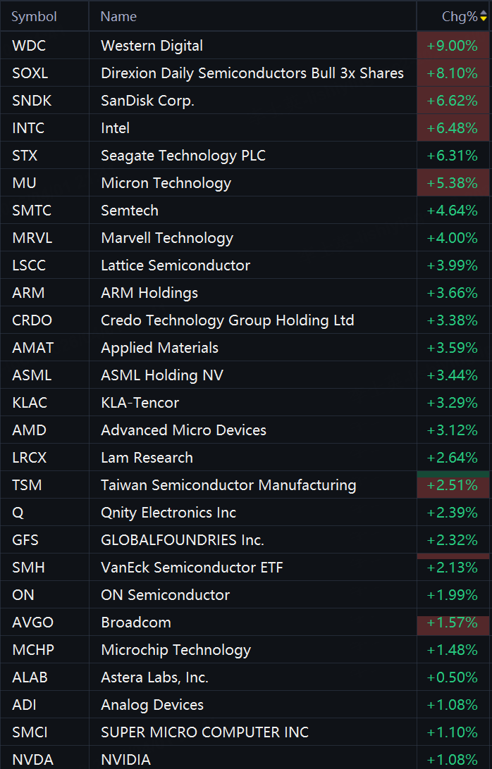 Chip stocks gained in morning trading. Western Digital rose 9%; SOXL rose 8%; SanDisk and Intel rose 7%; Seagate rose 6%; Micron rose 5%; Marvell rose 4%; ASML, AMD, and TSMC rose 3%; Nvidia rose 1%.