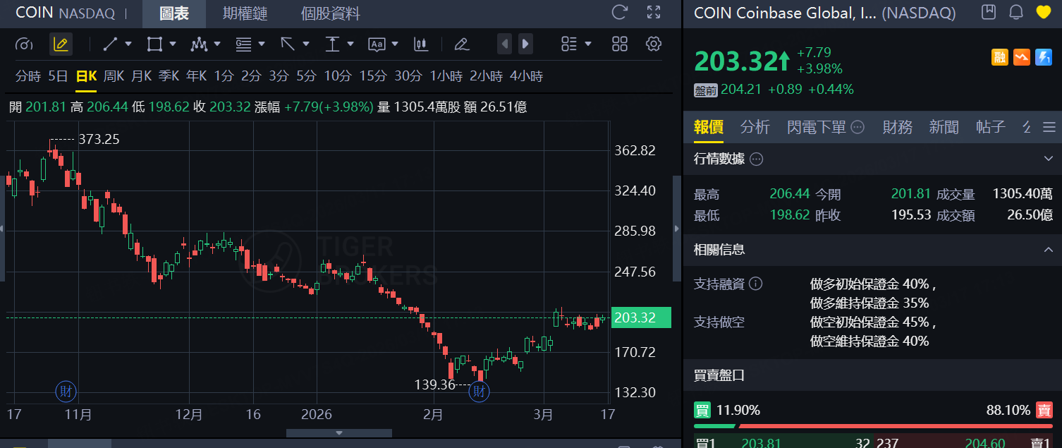 在数字资产价格回升带动下,多只加密货币相关股票同步上涨。全球最大企业比特币持有者Strategy(MSTR)最新披露,其在3月9日至15日期间以约15.7亿美元购入22,337枚比特币,均价约70,194美元,累计持仓增至761,068枚。加密交易所 Coinbase Global, Inc. 和互联网券商 Robinhood 股价亦录得上涨。