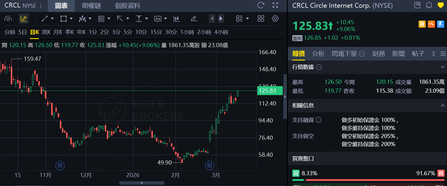 美国投行Clear Street在最新研报中将Circle股票评级从“持有”上调至“买入”,目标价由92美元大幅提升至136美元。该机构指出,自2月以来,与美元挂钩的稳定币USDC的采用率显著上升,反映越来越多金融机构和普通用户开始将其用于支付及跨境交易。受此消息提振,Circle股价周一上涨9%至125.83美元,创下去年10月以来新高;年初至今累计涨幅已达58%。