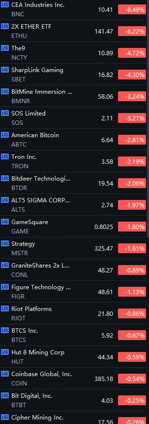Crypto stocks dropped. BNC down 8%; SBET and NCTY down 4%; BMNR and SOS down 3%; ABTC and Tron down 2%.