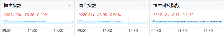 港股三大指数呈现高开低走行情,市场情绪表现疲弱,但总体跌幅不大。截止收盘, 恒生指数跌0.29%,恒生科技指数跌0.11%,国企指数跌0.50%。
