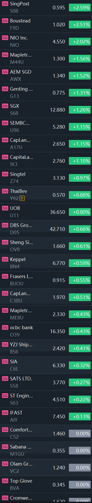 Singapore stocks opened higher on Monday. STI rose 0.6%; SingPost rose 2.6%; Boustead rose 2.5%; NIO rose 2%; AEM rose 1.5%; Genting Singapore rose 1.3%; Singtel rose 1%; UOB rose 0.8%; DBS rose 0.7%.