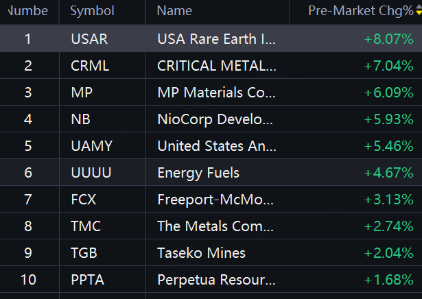 US rare earth companies jumped in premarket trading as China tightens rare earth export controls. USAR rose 8%; CRML up 7%; MP and NB up 6%; UAMY rose 5%; UUUU rose 4%.