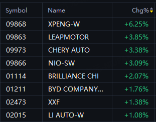 EV stocks rose in Hong Kong. XPeng rose 6%; Leapmotor rose 4%; Chery Auto, Nio rose 3%; BYD rose 2%; Li Auto rose 1%.