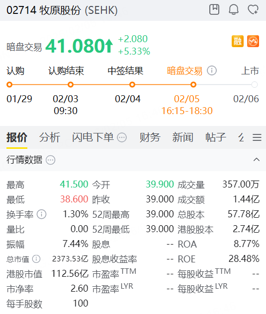 牧原股份 (02714.HK)暗盘现涨5.33%,报41.08港元,总市值超2300亿港元。每手100股,一手赚207.8港元。