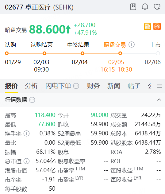 卓正医疗 暗盘现涨47.9%,报88.6港元。每手50股,一手赚1480港元。