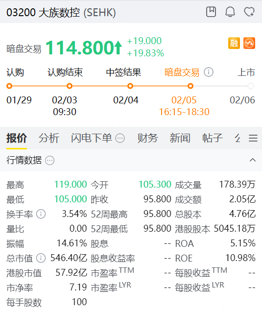 大族数控 (03200.HK)暗盘现涨19.83%,报114.8港元。每手100股,一手赚1900港元。