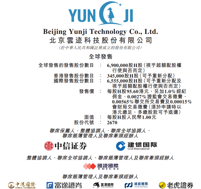 10月8日,云迹于10月8日至10月13日招股,该公司拟全球发售690万股H股,中国香港发售股份34.5万股,国际发售股份655.5万股,另有15%超额配股权,每股发售价95.6港元。每手50股,预期股份将于10月16日在联交所开始买卖。