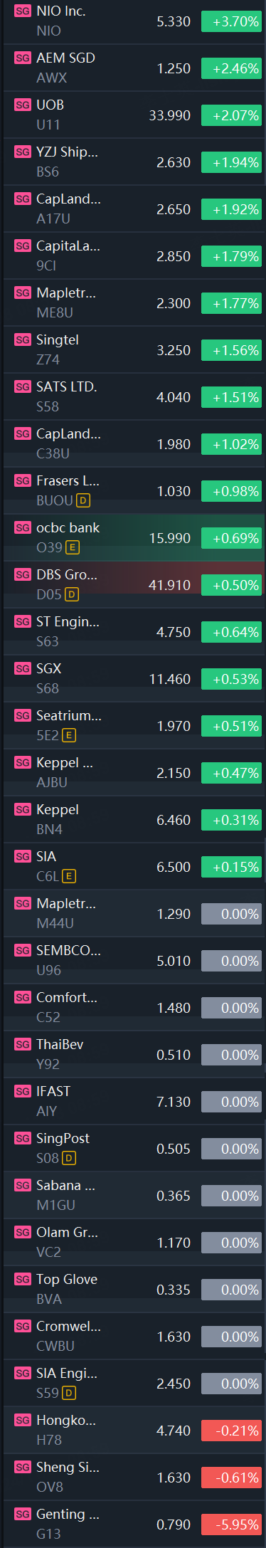 Singapore stocks opened higher on Friday. STI rose 0.6%; NIO rose 3.7%; UOB rose 2.1%; YZJ Shipbldg rose 1.9%; Singtel rose 1.6%; OCBC rose 0.7%; while Genting Singapore fell 6%.