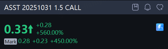 There are 2.67 million Strive option contracts traded on Monday, up 348% from the previous trading day. Call options account for 96% of overall option trades. Particularly high volume was seen for the $1.5 strike call option expiring October 31, with 212,367 contracts trading. ASST 20251031 1.5 CALL
