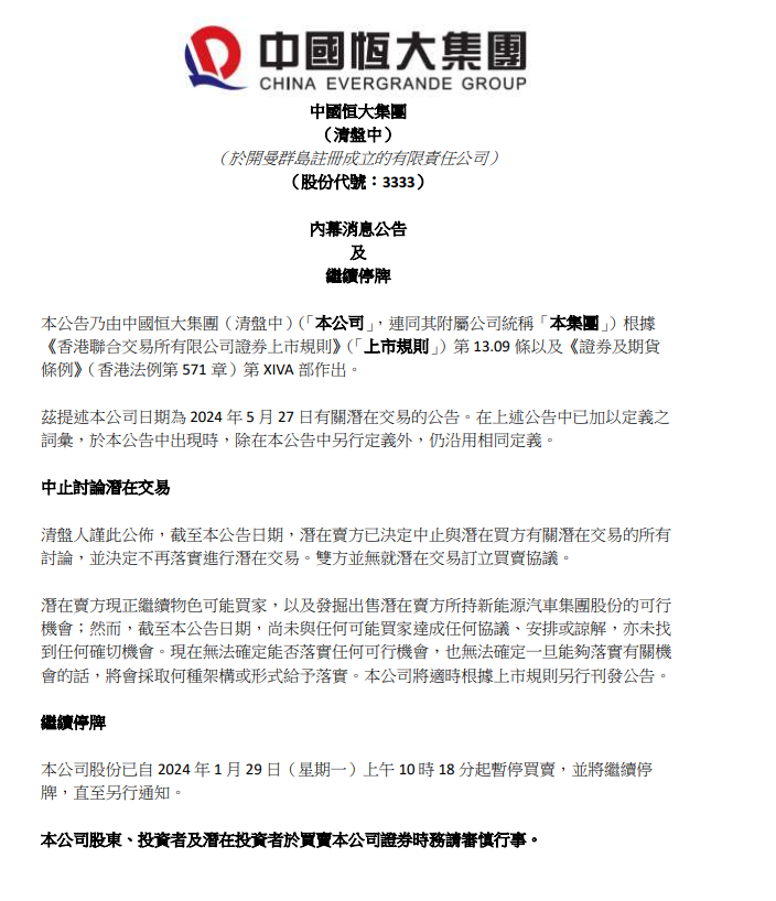 中国恒大:潜在卖方决定中止与潜在买方有关潜在交易的讨论