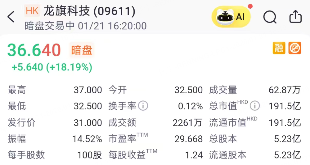 1月21日周三, 龙旗科技 开启暗盘,盘初大涨18%。不计手续费,每手赚564港元。公司是一家全球领先的智能产品平台型ODM企业,围绕“1+2+X”产品框架提供覆盖研发设计、软硬件系统开发到制造交付的一站式解决方案;按弗若斯特沙利文数据,2024年公司以32.6%份额位居全球智能手机ODM出货量第一,并以22.4%份额位居全球消费电子ODM出货量第二,核心客户覆盖小米、三星电子、联想、荣耀、OPPO、vivo等头部品牌。