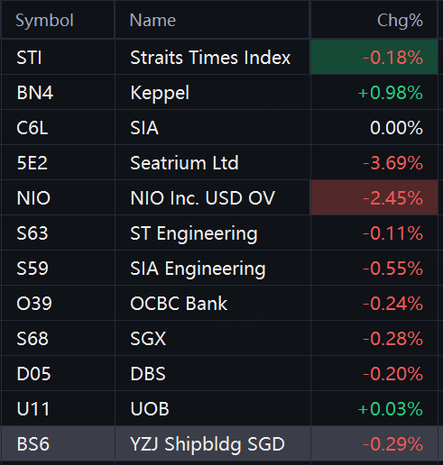 Singapore stocks opened lower on Friday. STI fell 0.2%; Keppel rose 1%; Seatrium fell 4%; NIO fell 3%; SGX fell 0.3%; DBS and OCBC fell 0.2%.