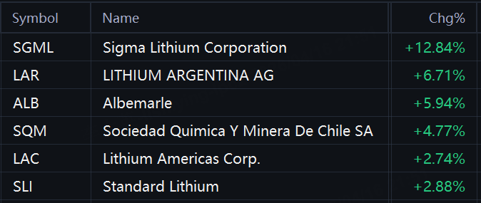 Lithium stocks jumped in morning trading. Sigma Lithium rose 13%; Lithium Argentina rose 7%; Albemarle and Sociedad Quimica Y Minera De Chile SA rose 5%; Standard Lithium and Lithium Americas rose 3%.