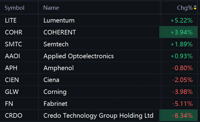 Optical communication stocks mixed in morning trading. Lumentum rose 5%; Coherent rose 4%; Semtech rose 2%; Applied Optoelectronics rose 1%; while Ciena fell 2%; Corning fell 4%; Fabrinet fell 5%; Credo Technology fell 8%.