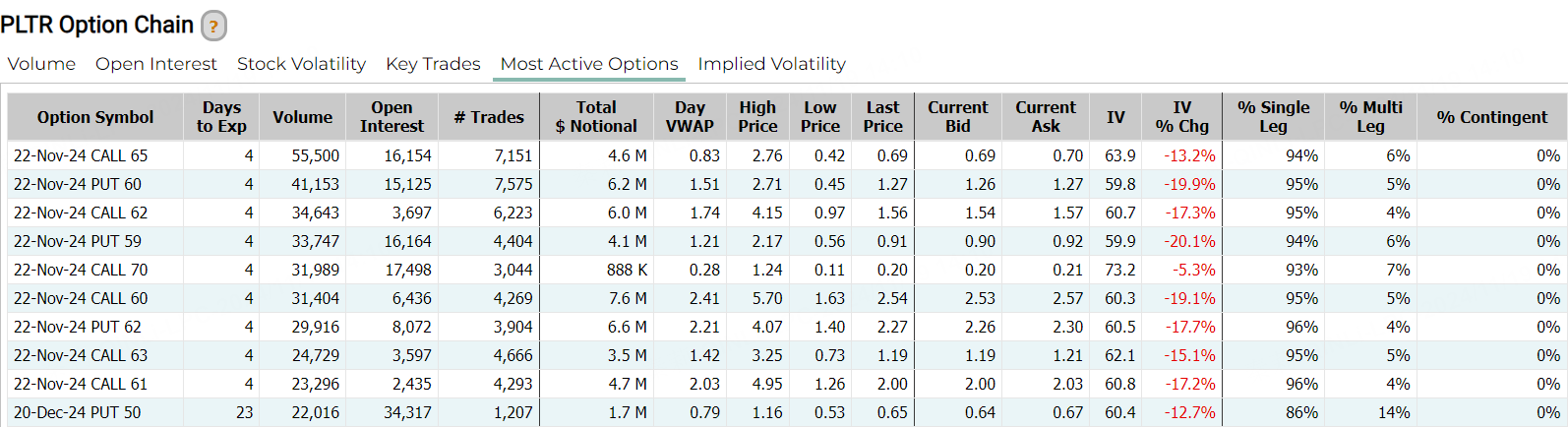 应用软件公司Palantir(PLTR)收跌6.86%,报61.26美元,该股年初至今涨256.79%。消息面上,Palantir上周四宣称将于11月26日A类普通股交易场所从纽交所转至纳斯达克全球精选市场。期权方面,PLTR当日成交约108万张合约,较90日均量放大2.25倍,看涨期权占比攀升至56.7%,其中于11月22到期的65美元行使价的看涨期权成交居前,成交逾5.5万张。