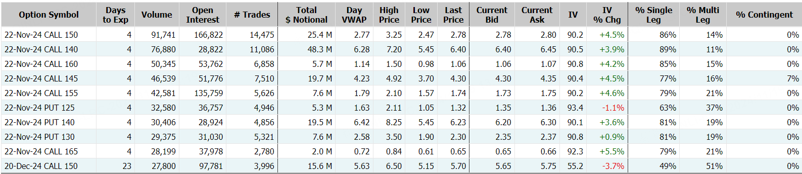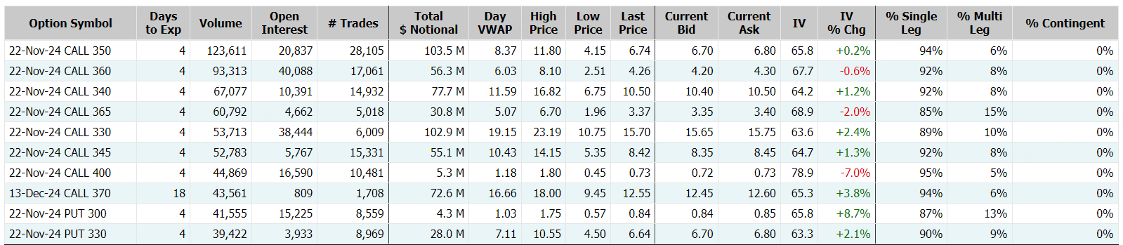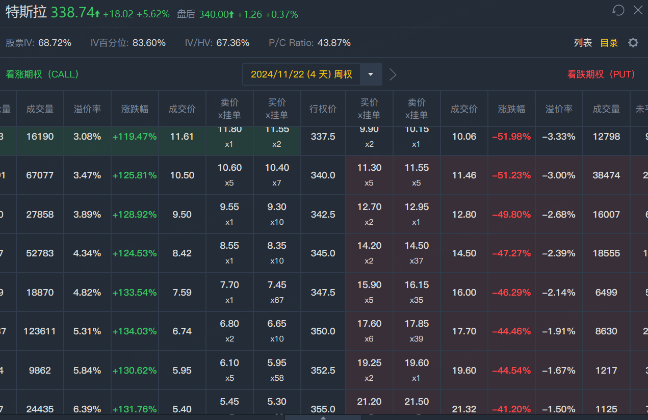 期权方面,特斯拉当日期权成交257.1万张合约,看涨期权占比为69.5%,其中于11月22日到期的350美元行使价的看涨期权成交居前,成交12.3万张。11月22日到期行权价350美元的call单,涨幅超134%,同日到期的其他call单涨幅也都在110%以上: