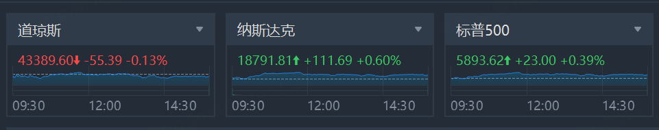 周一(11月18日)美股指数仅道指跌。标普500指数收涨23.00点,涨幅0.39%,报5893.62点。道指收跌55.39点,跌幅0.13%,报43389.60点。纳指收涨111.68点,涨幅0.60%,报18791.81点。