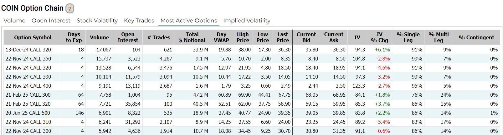 “比特币持仓大户”MicroStrategy微策投资(MSTR)涨超12.9%,加密货币交易所Coinbase涨6.4%。消息面上,Needham看好特朗普政府领导下的SEC变化或令Robinhood推出更多产品,报道称,特朗普料将私下会见Coinbase的CEO,讨论政府诸多任命事宜。另外,MicroStrategy周一宣布计划通过私募发行17.5亿美元可转换优先票据,计划用于比特币增持。期权方面,MSTR当日成交42.7万张合约,看涨期权占比攀升至58.4%,其中于11月22到期的400美元行使价的看涨期权成交居前,成交逾1.7万张。