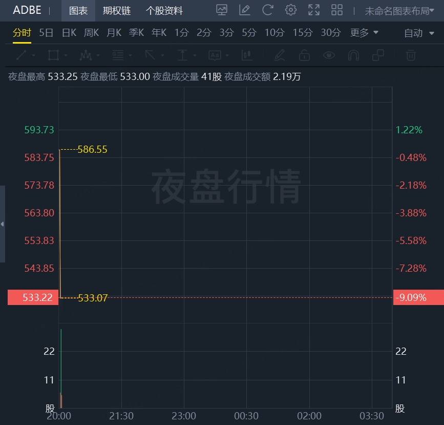 9月13日,美股夜盘时段,Adobe大跌逾9%,第四财季指引欠佳,引爆AI创收前景担忧。