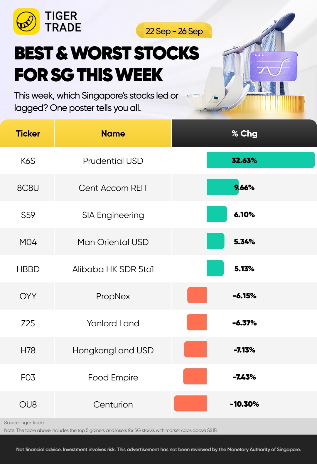 In terms of individual stocks, Prudential USD rose 33%, Cent Accom REIT rose 10%, SIA Engineering rose 6%; while Centurion fell 10%, and Food Empire, HongkongLand USD fell 7%.