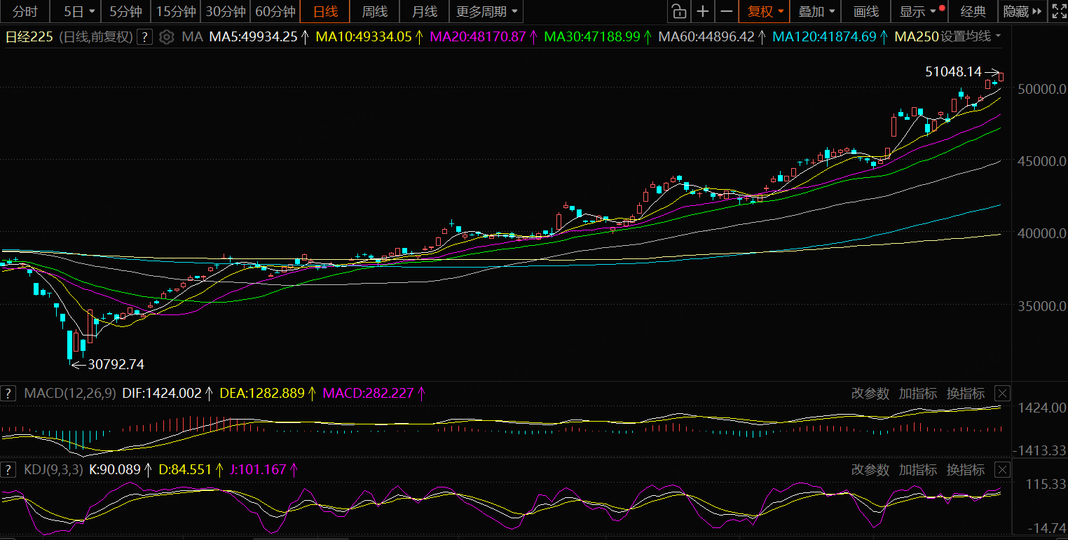 10月29日,日经225指数站上51000点,为历史首次,日内涨1.61%。