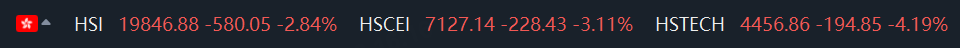 On Tuesday, November 12, 2024, the Hong Kong stock market experienced significant declines across major indices. The Hang Seng Index (HSI) fell by 2.84%, the Hang Seng China Enterprises Index (HSCEI) dropped by 3.11%, the Hang Seng Tech Index (HSTECH) decreased by 4.19%, and the Hang Seng Composite Index (HSCCI) was down by 2.45%.