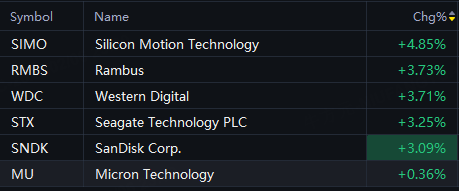 Silicon Motion up 5%; Rambus, Western Digital up 4%; SanDisk, Seagate up 3%.