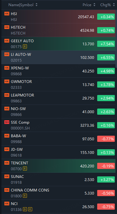 Electric vehicle makers jumped in morning trading. Geely Automobile rose 7.5%; Li Auto rose 6.6%; XPeng rose 5%; Nio rose 2.6%.