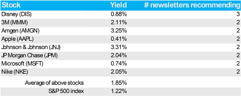 下表反映了这一替代方法。它列出了道指30只股票中,至少被两份投资通讯推荐的股票。这些股票的平均股息率高于标普500,但低于接近4%的“Dogs of the Dow”股票。然而,表中的股票在未来一年内很可能表现优于“Dogs of the Dow”。