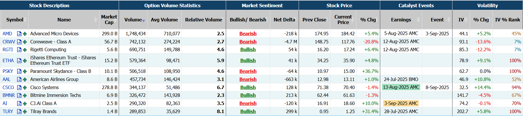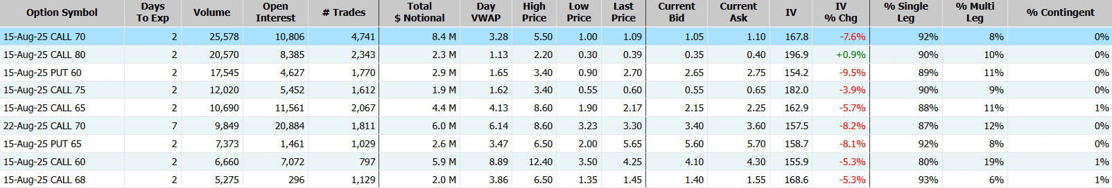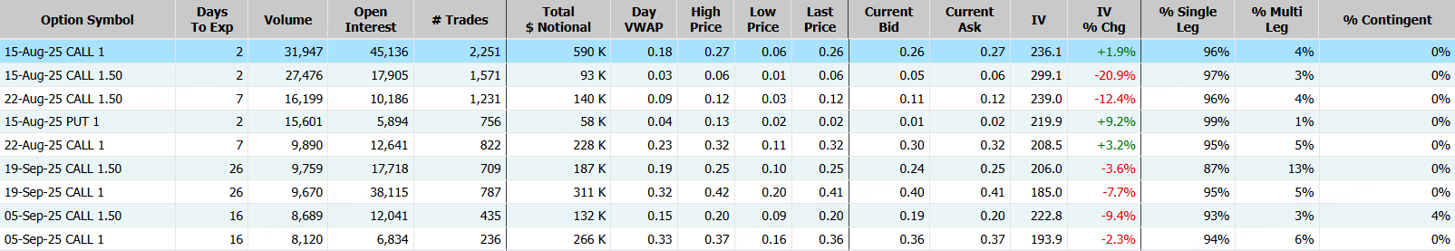 大麻概念股Tilray Inc.隔夜涨超31%,期权合约成交28.99万张,较90日均量放大8.1倍。8月15日到期的1美元的行权看涨期权交易量特别高,共有31,947份合约交易。 $TLRY 20250815 1.0 CALL$