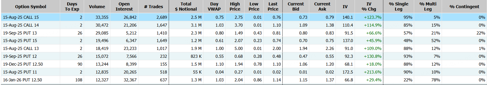 Paramount Skydance隔夜涨超36%,期权合约成交50.65万张,较90日均量放大4.6倍。8月15日到期的15美元的行权看涨期权交易量特别高,共有33,355份合约交易。 $PSKY 20250815 15.0 CALL$