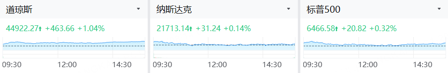 周三,美股三大指数齐涨。截止收盘,道琼斯指数涨1.04%,纳斯达克综合指数涨0.14%,标普500指数涨0.32%。