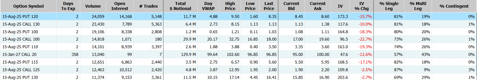 CoreWeave隔夜跌近21%,期权合约成交74.34万张,较90日均量放大2.7倍。8月15日到期的120美元的行权看跌期权交易量特别高,共有24,059份合约交易。 $CRWV 20250815 120.0 PUT$