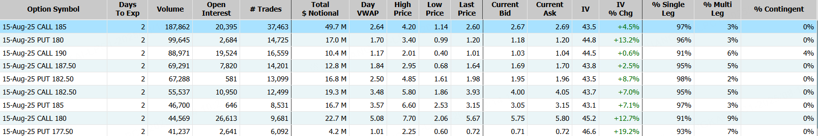 美国超微公司隔夜涨超5%,期权合约成交177.02万张,较90日均量放大2.5倍。8月15日到期的185美元的行权看涨期权交易量特别高,共有187,862份合约交易。 $AMD 20250815 185.0 CALL$