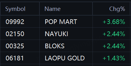 New consumption stocks rallied in Hong Kong. Pop Mart rose 4%, Nayuki and Bloks rose 2%; Laopu Gold rose 1%.