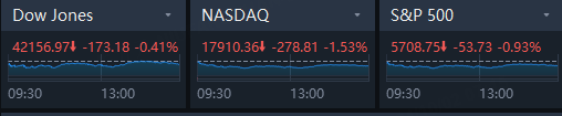 On Wall Street, the Dow Jones Industrial Average fell 173.18 points, or 0.41%, to 42,156.97, the S&P 500 fell 53.73 points, or 0.93%, to 5,708.75 and the Nasdaq Composite fell 278.81 points, or 1.53%, to 17,910.36.