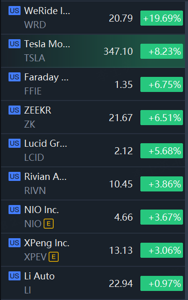 EV stocks jumped on Monday after Bloomberg News reported that President-elect Donald Trump's transition team was planning to set up federal regulations for autonomous vehicles. WeRide rose 20%; Tesla rose 8%; Faraday Future and Zeekr rose 7%; Lucid rose 6%; Rivian and NIO rose 4%; XPeng rose 3%; Li Auto rose 1%.