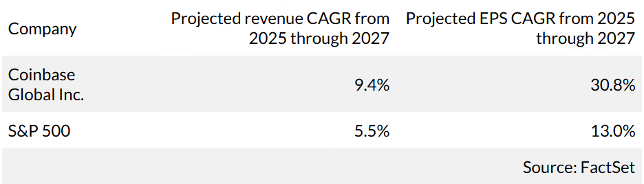 Analysts polled by FactSet expect Coinbase to increase its earnings per share at an annualized pace of 30.8% from 2025 through 2027.
