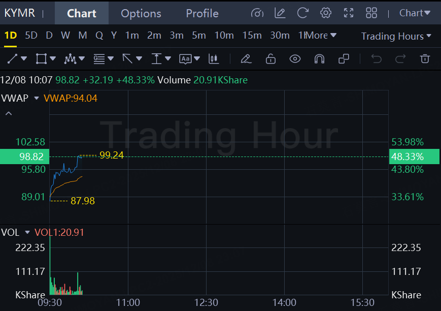 Shares of Kymera Therapeutics rose 48% to $98.82. Kymera says its experimental oral treatment for eczema eased symptoms and itching in a small early-stage study, while also helping patients who had asthma or hay fever.