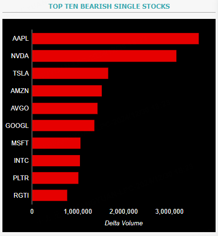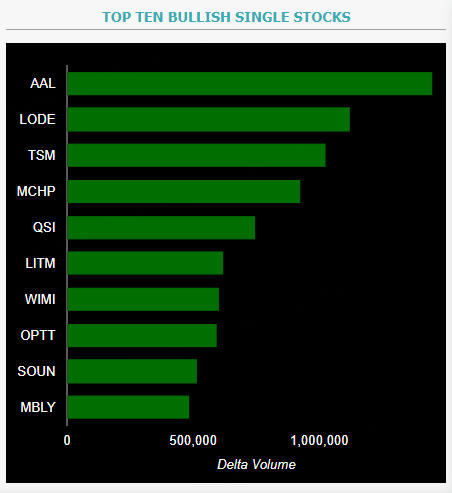 This report shows stocks with the highest volume of bullish and bearish activity by option delta volume, which converts option volume to an equivalent stock volume (bought or sold).