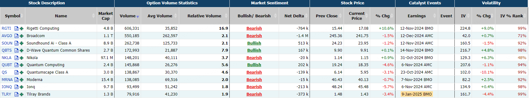 Top 10 bearish stocks: Apple, Nvidia, Tesla, Amazon.com, Broadcom, Alphabet, Microsoft, Intel, Palantir, Rigetti Computing