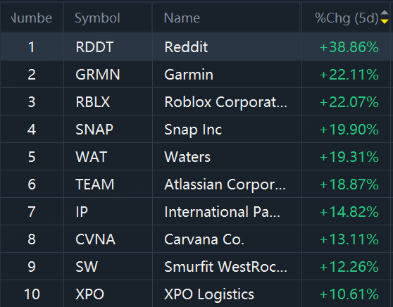 以下是截至11月1日当周,市值超过150亿美元的标普500指数中涨幅和跌幅最大的前10只股票: